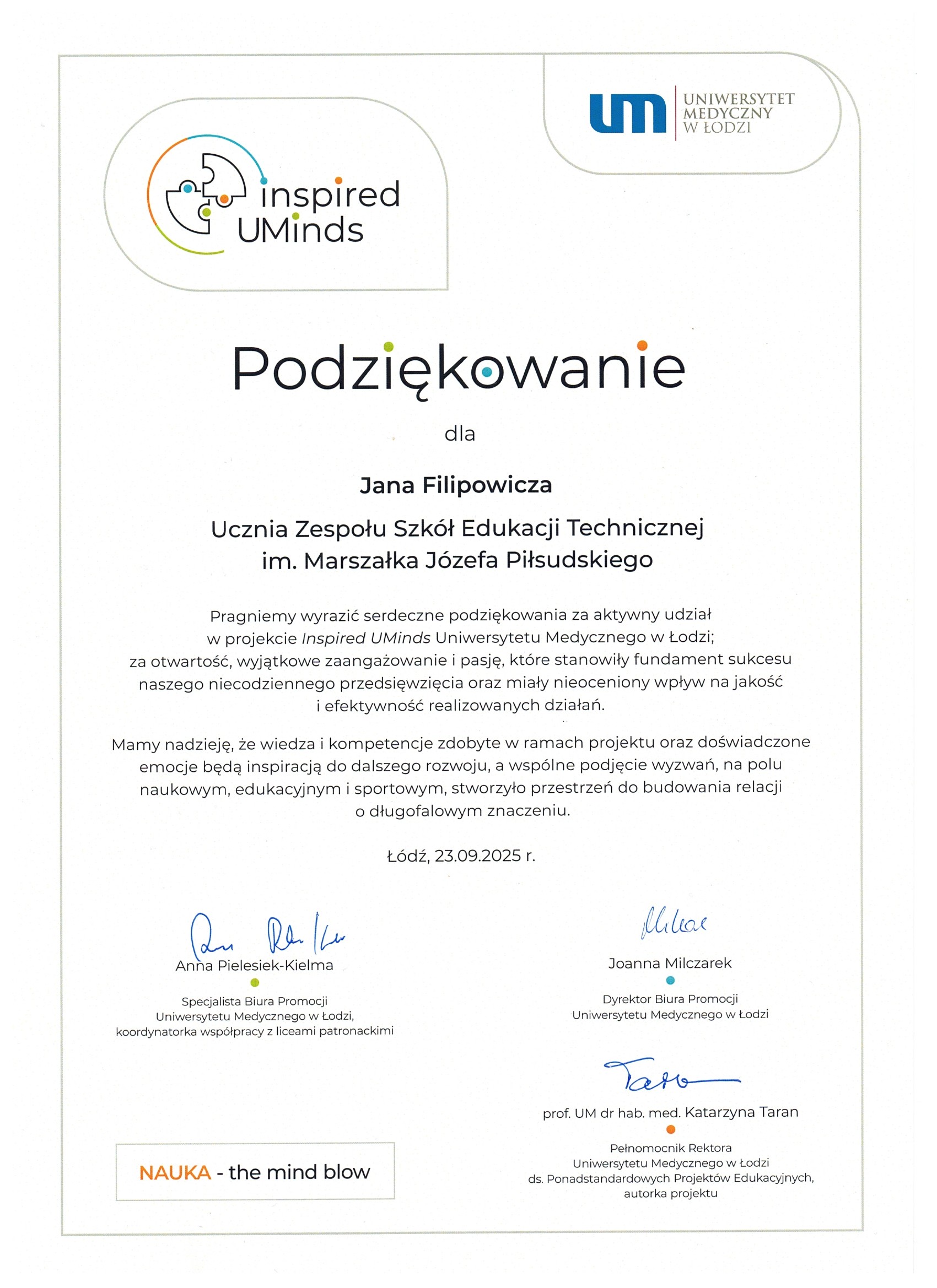 Janek Filipowicz - uczeń klasy 3 o profilu technik elektryk wziął udział w projekcie "Inspired UMinds" realizowanym przez Uniwersytet Medyczny w Łodzi. Projekt kształtuje w młodych ludziach m.in. kompetencje przyszłości takie, jak: strategiczne uczenie się, analityczne i krytyczne myślenie oraz innowacyjność i pasje.