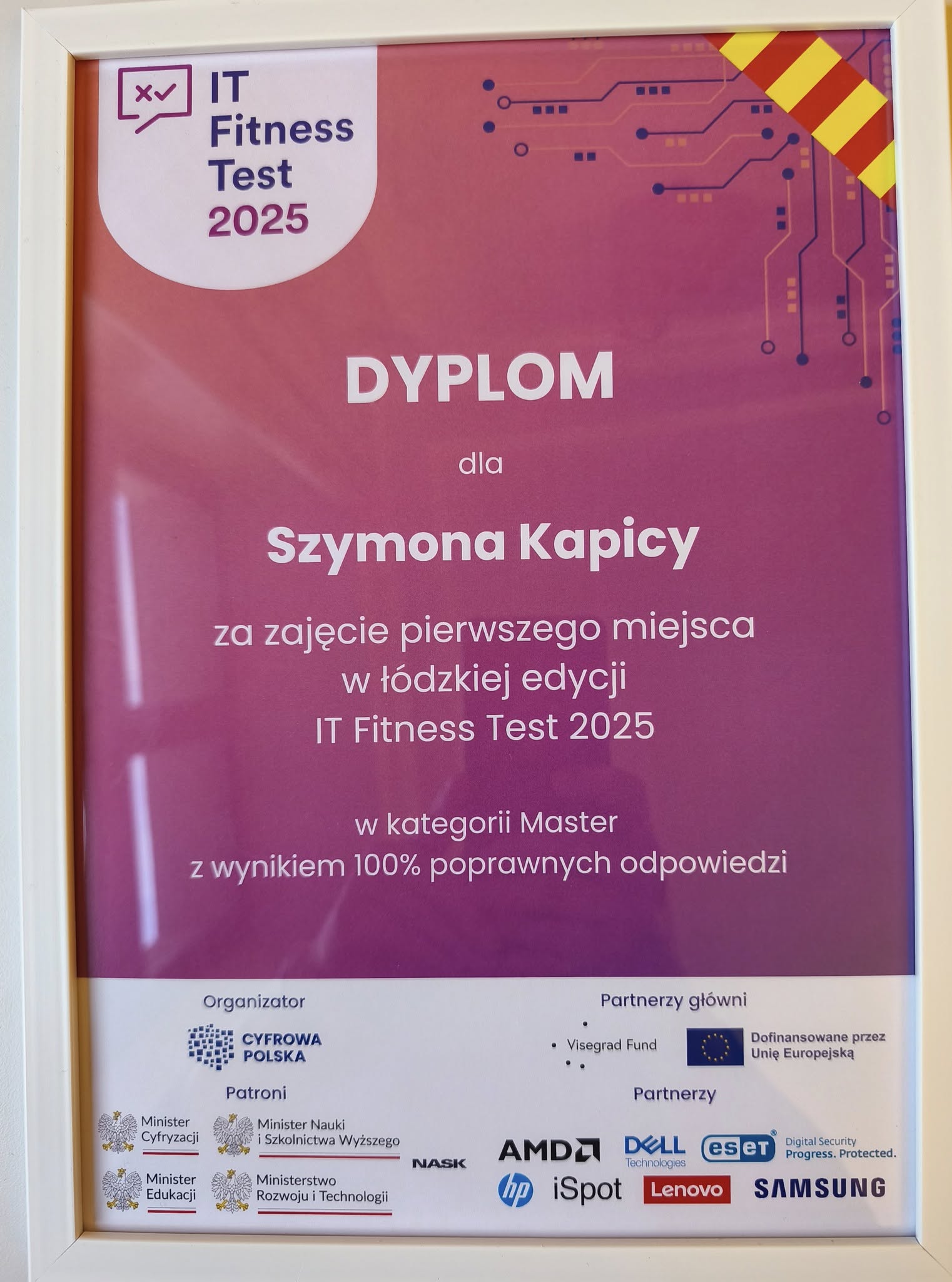 Kolejny wielki sukces naszego ucznia. Szymon Kapica z klasy 4 in został dziś laureatem konkursu IT Fitness. Szymon zdobył pierwsze miejsce w Łodzi, wyprzedzając jednocześnie 168 innych uczestników, rozwiązując IT Master Test ze 100% poprawnością.