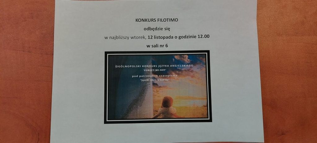 W dniu 12 listopada 2024 r. w samo południe, w pracowni numer 6 naszej szkoły odbył się kolejny Ogólnopolski Konkurs Języka Angielskiego „FORGET -ME -NOT”, pod patronatem czasopisma Języki Obce w Szkole. Uczniowie klas pierwszych, drugich i trzecich ZSET rozwiązywali test opracowany na podstawie opowiadań, sentencji i współczesnych piosenek. Z niecierpliwością czekamy na wyniki