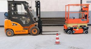 Jest to kolejne z urządzeń dźwignicowych, które znajduje się w naszej szkole. Od 2021 roku jesteśmy w posiadaniu wózka podnośnikowego z mechanicznym napędem podnoszenia, potocznie zwanego wózkiem widłowym. Uprawnienia do obsługi wózka zdobyło już wielu naszych uczniów i absolwentów.